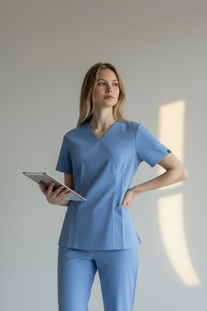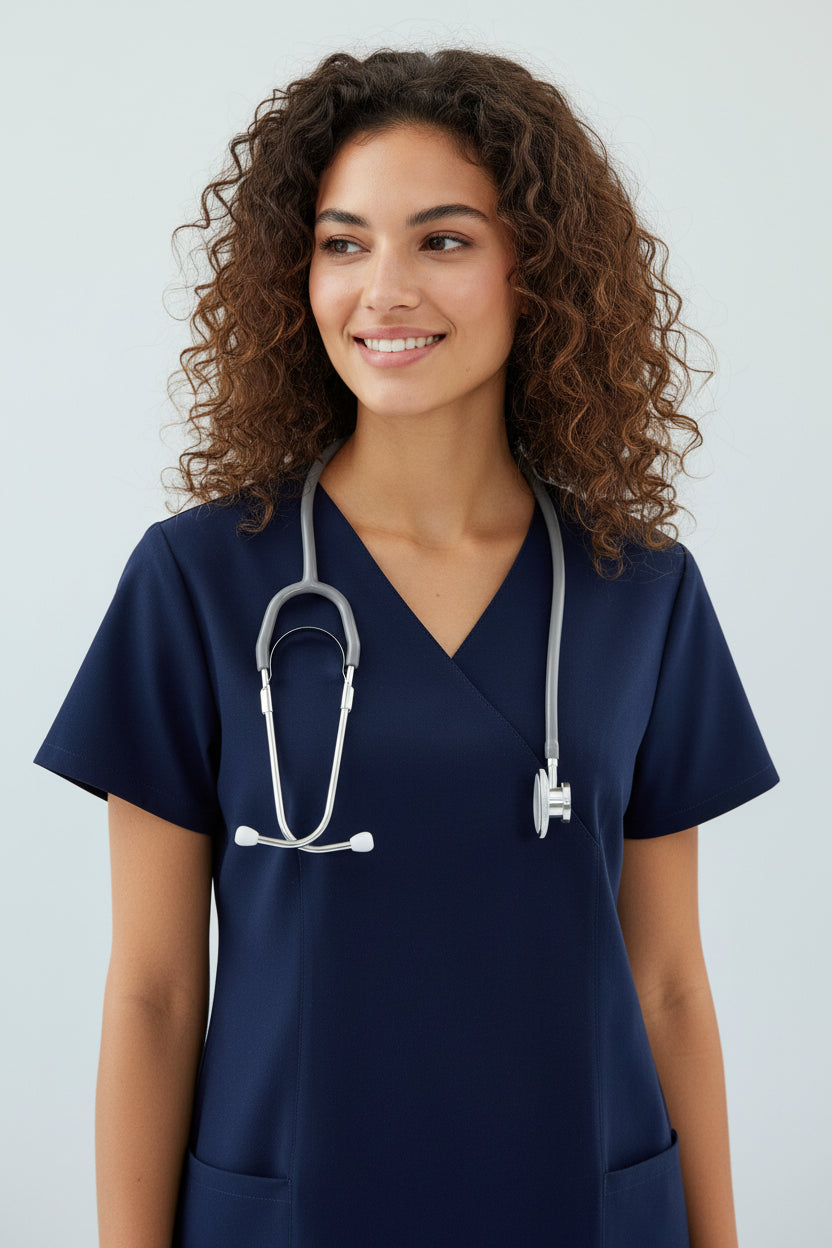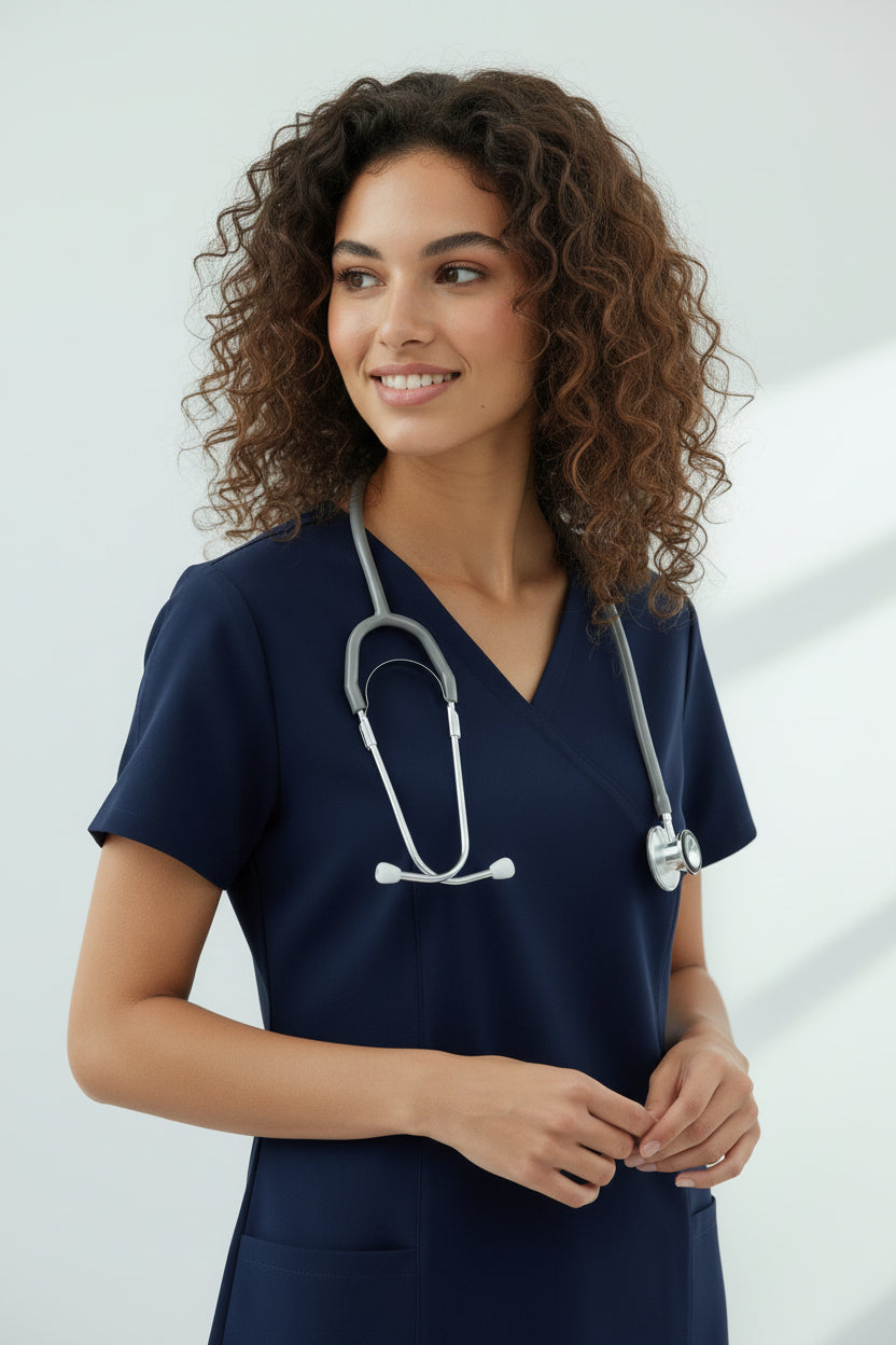 Do not dry clean. Avoid using fabric softeners as they can reduce the fabric's moisture-wicking properties. Iron on low heat if needed. Store in a cool, dry place away from direct sunlight. Regular washing maintains the professional appearance and performance of your scrubs.
